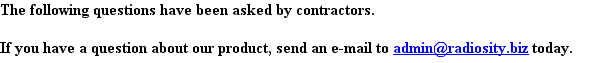 Q. If I become a certified Radiosity Applicator, do I work for Radiosity? A. No, you remain an independent contractor. We just show you how to install Radiosity. |